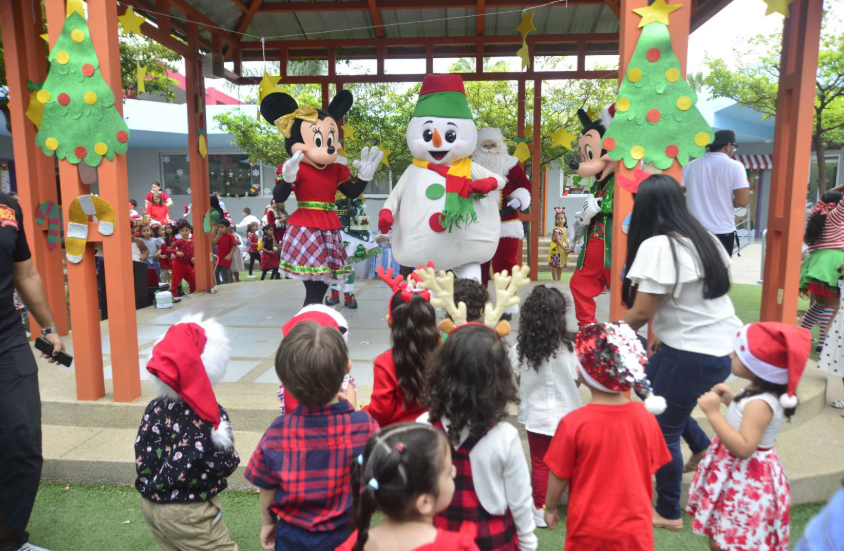 El 19 de diciembre, estudiantes de instituciones educativas particulares en Guayaquil celebraron la Navidad con diferentes actividades, marcando el inicio de sus vacaciones que se extenderán hasta el 6 de enero de 2025. En la Unidad Educativa Julio María Matovelle, ubicada en el centro-sur de la ciudad, los más pequeños disfrutaron de una celebración muy especial. Kiara Rosada, animadora de Ritmos, Eventos y Animaciones, se encargó de darle un toque festivo al evento, bailando junto a doce niños del nivel inicial (de 3 años) mientras cantaban villancicos. Los niños también compartieron jugos y snacks, y cada uno recibió un regalo debajo del árbol de Navidad en su salón.