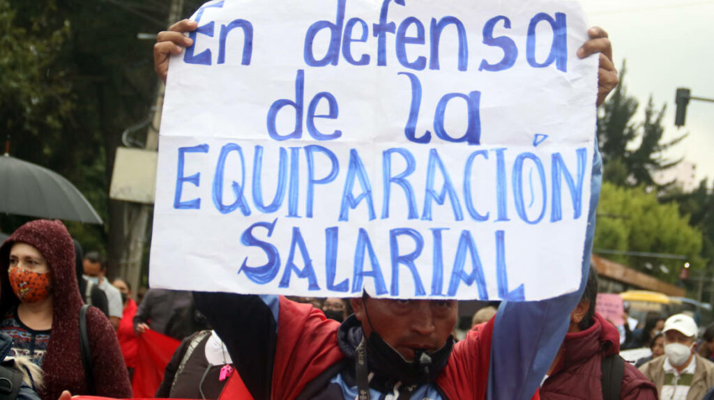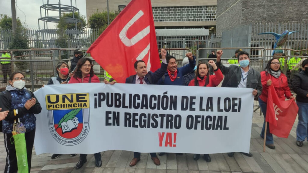 Este viernes 13 de mayo de 2022, varios dirigentes y estudiantes se ataron a postes de la Plataforma Gubernamental Financiera, en Quito. El Magisterio exige al Ministerio de Finanzas que destine presupuesto a la educación y al Gobierno que cumpla con la equiparación salarial.